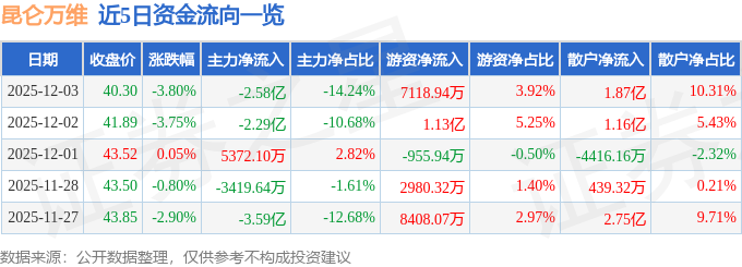 12月3日的资金流向数据方面,主力资金净流出2.58亿元,占总成交额14.24%,游资资金净流入7118.94万元,占总成交额3.92%,散户资金净流入1.87亿元,占总成交额10.31%。