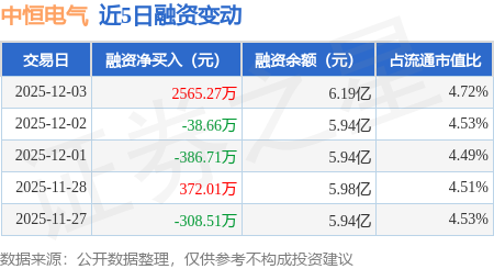 证券之星消息,12月3日,中恒电气(002364)融资买入6135.24万元,融资偿还3569.97万元,融资净买入2565.27万元,融资余额6.19亿元。