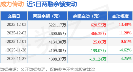 证券之星消息,12月3日,威力传动(300904)融资买入1090.21万元,融资偿还469.68万元,融资净买入620.53万元,融资余额5221.17万元,近3个交易日已连续净买入累计1111.87万元。
