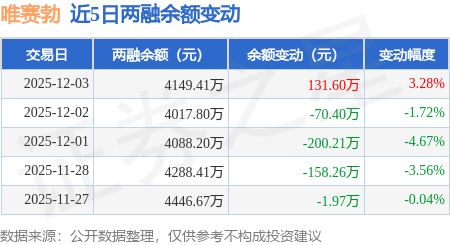 证券之星消息,12月3日,唯赛勃(688718)融资买入356.48万元,融资偿还224.88万元,融资净买入131.6万元,融资余额4149.41万元。