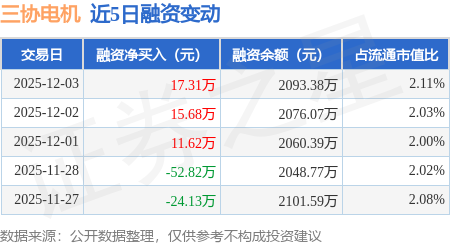 证券之星消息,12月3日,三协电机(920100)融资买入76.68万元,融资偿还59.37万元,融资净买入17.31万元,融资余额2093.38万元,近3个交易日已连续净买入累计44.61万元。