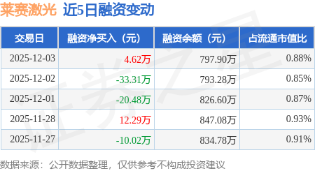 证券之星消息,12月3日,莱赛激光(920363)融资买入21.33万元,融资偿还16.71万元,融资净买入4.62万元,融资余额797.9万元。