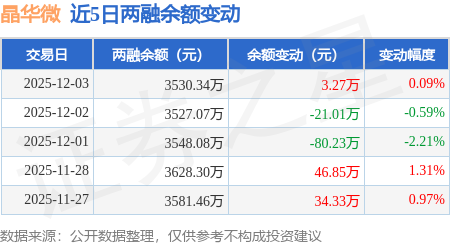 证券之星消息,12月3日,晶华微(688130)融资买入119.69万元,融资偿还116.42万元,融资净买入3.27万元,融资余额3530.34万元。