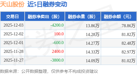 证券之星消息,12月3日,天山股份(000877)融资买入446.79万元,融资偿还445.19万元,融资净买入1.6万元,融资余额3.88亿元。