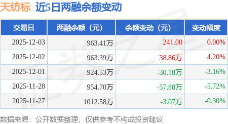 证券之星消息,12月3日,天纺标(920753)融资买入32.03万元,融资偿还32.01万元,融资净买入0.02万元,融资余额963.41万元,近20个交易日中有11个交易日出现融资净买入。