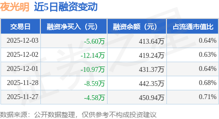 证券之星消息,12月3日,夜光明(920527)融资买入22.71万元,融资偿还28.3万元,融资净卖出5.6万元,融资余额413.64万元。