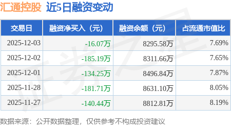 证券之星消息,12月3日,汇通控股(603409)融资买入190.12万元,融资偿还206.19万元,融资净卖出16.07万元,融资余额8295.58万元。