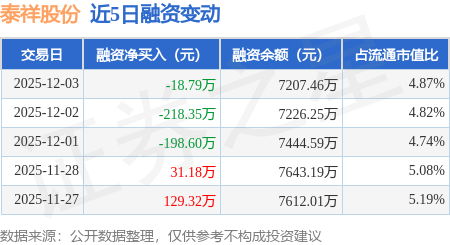 证券之星消息,12月3日,泰祥股份(301192)融资买入300.07万元,融资偿还318.86万元,融资净卖出18.79万元,融资余额7207.46万元。