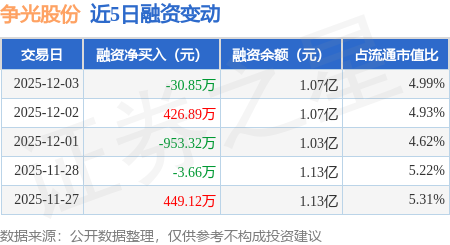 证券之星消息,12月3日,争光股份(301092)融资买入2169.92万元,融资偿还2200.77万元,融资净卖出30.85万元,融资余额1.07亿元,近20个交易日中有11个交易日出现融资净买入。