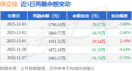 证券之星消息,12月3日,保立佳(301037)融资买入104.92万元,融资偿还175.59万元,融资净卖出70.67万元,融资余额1789.95万元。