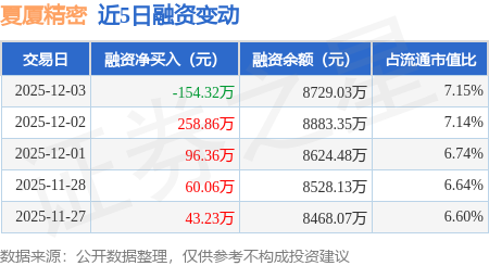 证券之星消息,12月3日,夏厦精密(001306)融资买入549.69万元,融资偿还704.01万元,融资净卖出154.32万元,融资余额8729.03万元,近20个交易日中有15个交易日出现融资净买入。