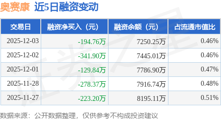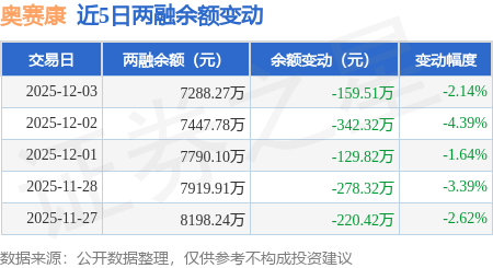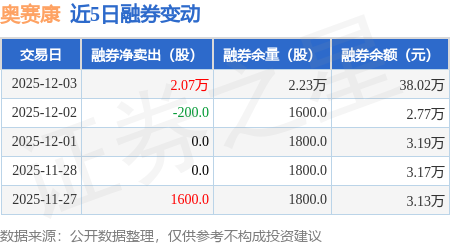 证券之星消息,12月3日,奥赛康(002755)融资买入412.31万元,融资偿还607.07万元,融资净卖出194.76万元,融资余额7250.25万元。