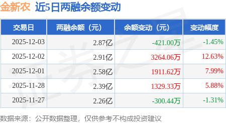 证券之星消息,12月3日,金新农(002548)融资买入5052.7万元,融资偿还5473.7万元,融资净卖出421.0万元,融资余额2.87亿元。