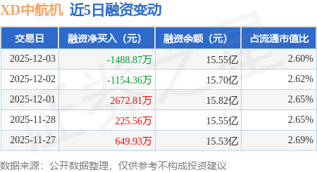 证券之星消息,12月3日,XD中航机(600372)融资买入5317.7万元,融资偿还6806.57万元,融资净卖出1488.87万元,融资余额15.55亿元。