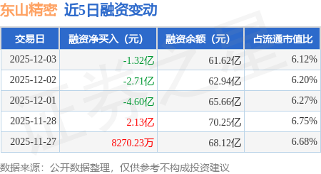 证券之星消息,12月3日,东山精密(002384)融资买入2.99亿元,融资偿还4.31亿元,融资净卖出1.32亿元,融资余额61.62亿元,近20个交易日中有11个交易日出现融资净买入。