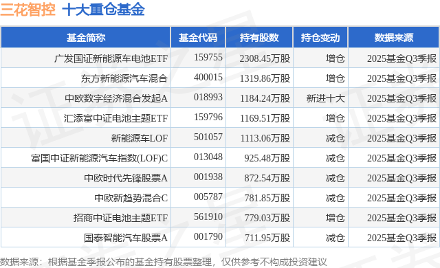 根据2025基金Q3季报公募基金重仓股数据,重仓该股的公募基金共190家,其中持有数量最多的公募基金为广发基金的广发国证新能源车电池ETF。广发国证新能源车电池ETF目前规模为150.97亿元,最新净值1.0213(12月3日),较上一交易日下跌1.44%,近一年上涨46.7%。该公募基金现任基金经理为罗国庆。罗国庆在任的基金产品包括:广发中证传媒ETF,管理时间为2017年12月27日至今,期间收益率为-2.15%;广发中证传媒ETF联接A,管理时间为2018年1月2日至今,期间收益率为-1.33%;广发中证A100ETF联接A,管理时间为2019年5月27日至今,期间收益率为34.97%;广发中证创新药产业ETF,管理时间为2020年12月3日至今,期间收益率为-35.1%。