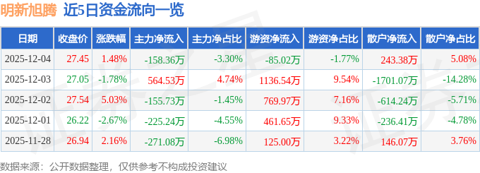 证券之星消息,截至2025年12月4日收盘,明新旭腾(605068)报收于27.45元,上涨1.48%,换手率1.09%,成交量1.76万手,成交额4795.02万元。