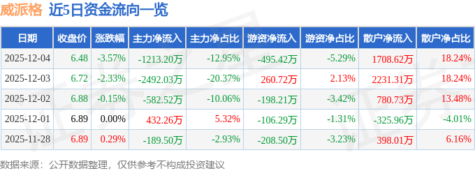 证券之星消息,截至2025年12月4日收盘,威派格(603956)报收于6.48元,下跌3.57%,换手率2.51%,成交量14.31万手,成交额9369.21万元。