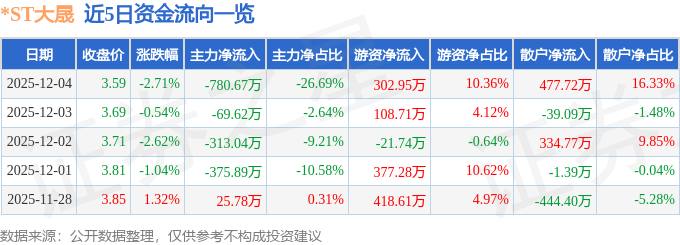 证券之星消息,截至2025年12月4日收盘,*ST大晟(600892)报收于3.59元,下跌2.71%,换手率1.44%,成交量8.07万手,成交额2925.3万元。