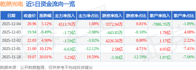 证券之星消息,截至2025年12月4日收盘,乾照光电(300102)报收于20.96元,上涨5.12%,换手率22.39%,成交量205.2万手,成交额41.83亿元。