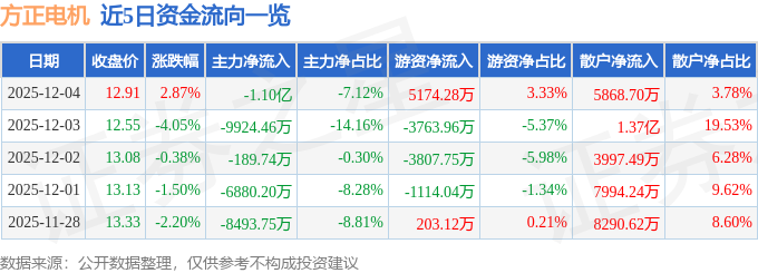 证券之星消息,截至2025年12月4日收盘,方正电机(002196)报收于12.91元,上涨2.87%,换手率23.97%,成交量117.04万手,成交额15.52亿元。