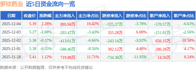 证券之星消息,截至2025年12月4日收盘,罗欣药业(002793)报收于5.39元,上涨2.28%,换手率1.48%,成交量16.12万手,成交额8599.53万元。