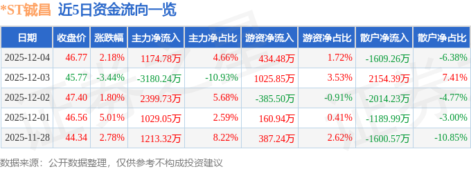 证券之星消息,截至2025年12月4日收盘,*ST铖昌(001270)报收于46.77元,上涨2.18%,换手率2.66%,成交量5.4万手,成交额2.52亿元。