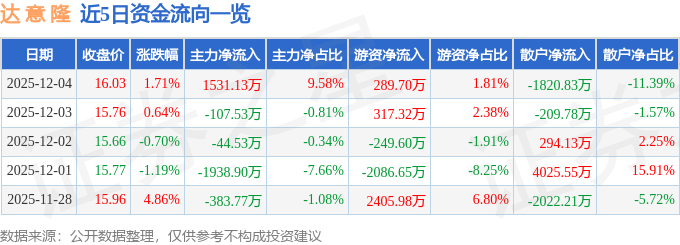 证券之星消息,截至2025年12月4日收盘,达 意 隆(002209)报收于16.03元,上涨1.71%,换手率6.4%,成交量10.01万手,成交额1.6亿元。