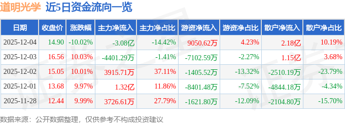 证券之星消息,截至2025年12月4日收盘,道明光学(002632)报收于14.9元,下跌10.02%,跌停,换手率24.36%,成交量141.75万手,成交额21.38亿元。