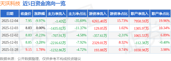 证券之星消息,截至2025年12月4日收盘,天沃科技(002564)报收于7.95元,下跌9.97%,跌停,换手率5.72%,成交量49.1万手,成交额3.98亿元。