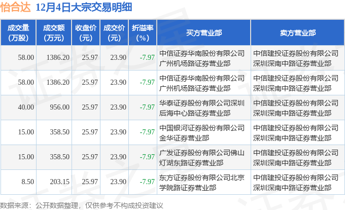 证券之星消息,12月4日怡合达发生大宗交易,交易数据如下: