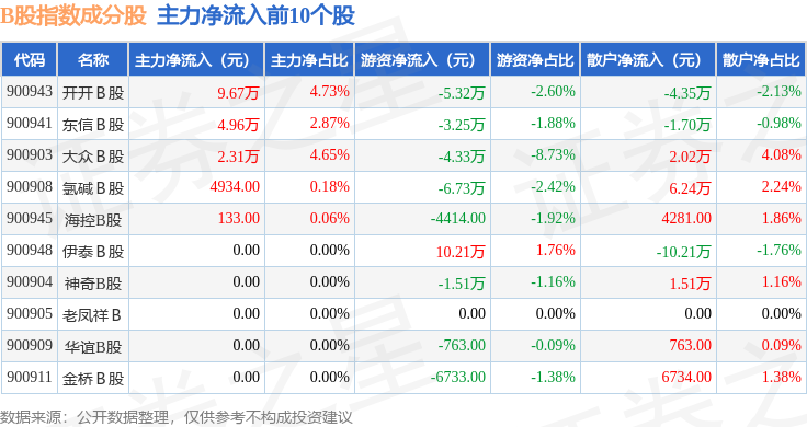 资金流向方面,B股指数(000003)成份股当日主力资金净流出合计21.2万元,游资资金净流出合计10.61万元,散户资金净流入合计31.8万元。成份股资金流向详情见下表: