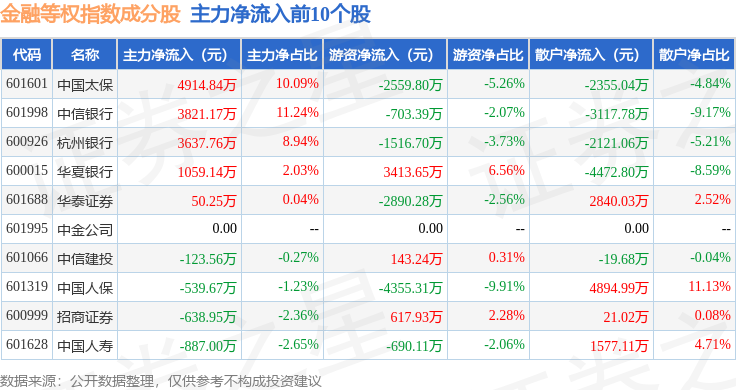 资金流向方面,金融等权(000076)指数成份股当日主力资金净流出合计15.98亿元,游资资金净流入合计8.27亿元,散户资金净流入合计7.71亿元。成份股资金流向详情见下表: