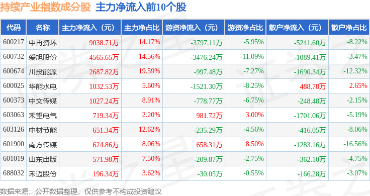 资金流向方面,持续产业(000114)指数成份股当日主力资金净流出合计7.71亿元,游资资金净流出合计1.4亿元,散户资金净流入合计9.12亿元。成份股资金流向详情见下表: