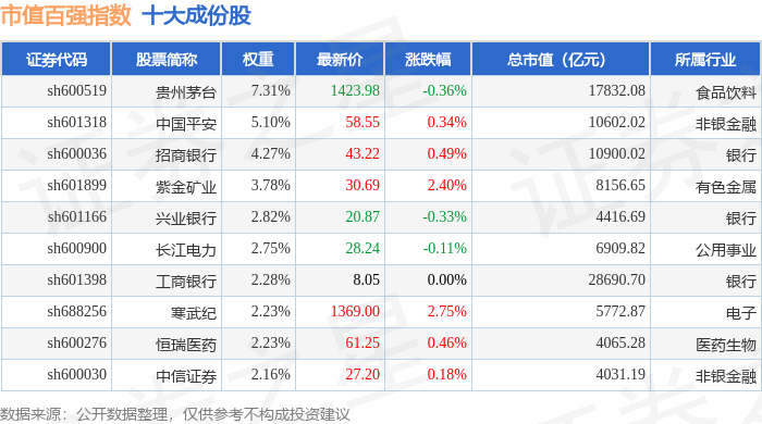 市值百强(000155)指数十大成份股详情如下: