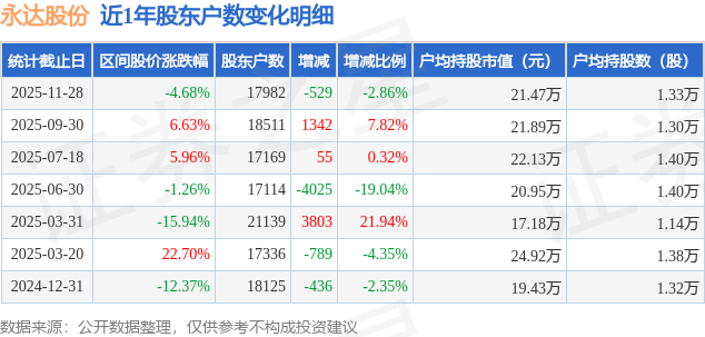 从股价来看,2025年9月30日至2025年11月28日,永达股份区间跌幅为4.68%,在此期间股东户数减少529.0户,减幅为2.86%。