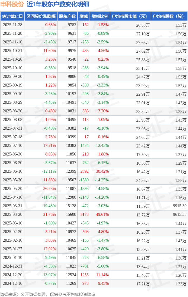 从股价来看,2025年11月20日至2025年11月28日,申科股份区间涨幅为0.63%,在此期间股东户数增加152.0户,增幅为1.58%。