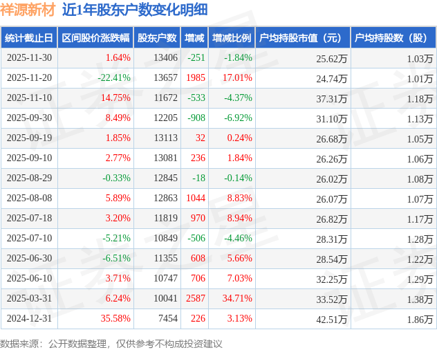 从股价来看,2025年11月20日至2025年11月30日,祥源新材区间涨幅为1.64%,在此期间股东户数减少251.0户,减幅为1.84%。