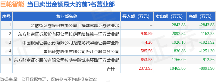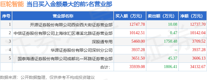 证券之星消息,沪深交易所2025年12月4日公布的交易公开信息显示,巨轮智能(002031)因日涨幅偏离值达到7%的前5只证券登上龙虎榜。此次是近5个交易日内第1次上榜。