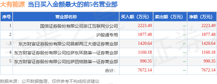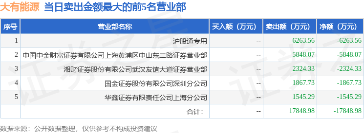 证券之星消息,沪深交易所2025年12月4日公布的交易公开信息显示,大有能源(600403)因有价格涨跌幅限制的日收盘价格跌幅偏离值达到7%的前五只证券登上龙虎榜。此次是近5个交易日内第1次上榜。
