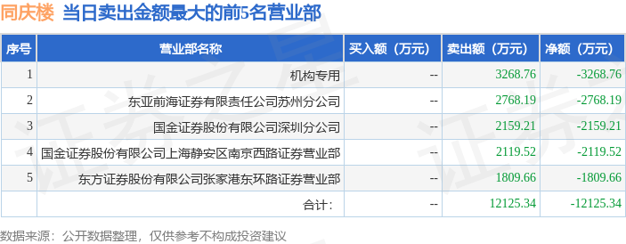 证券之星消息,沪深交易所2025年12月4日公布的交易公开信息显示,同庆楼(605108)因有价格涨跌幅限制的日价格振幅达到15%的前五只证券,有价格涨跌幅限制的日收盘价格跌幅偏离值达到7%的前五只证券登上龙虎榜。此次是近5个交易日内第2次上榜。