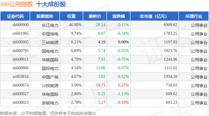 300公用(000917)指数十大成份股详情如下: