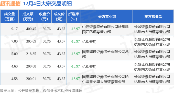 证券之星消息,12月4日超讯通信发生大宗交易,交易数据如下: