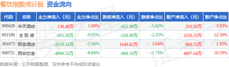 资金流向方面,餐饮指数(399238)成份股当日主力资金净流出合计7407.8万元,游资资金净流入合计167.75万元,散户资金净流入合计7240.05万元。成份股资金流向详情见下表: