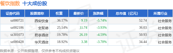 证券之星消息,12月4日,餐饮指数(399238)报收于1411.07点,跌4.69%,成交10.9亿元,换手率4.87%。当日该指数成份股中,下跌的有4家,西安饮食以5.74%的跌幅领跌。