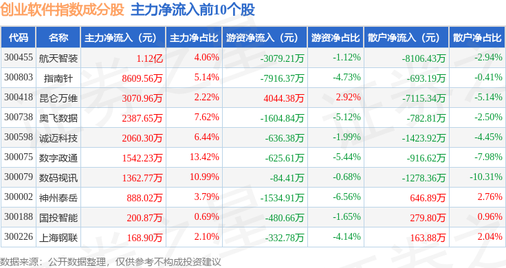 资金流向方面,创业软件(399264)指数成份股当日主力资金净流出合计5.7亿元,游资资金净流出合计1110.34万元,散户资金净流入合计5.81亿元。成份股资金流向详情见下表: