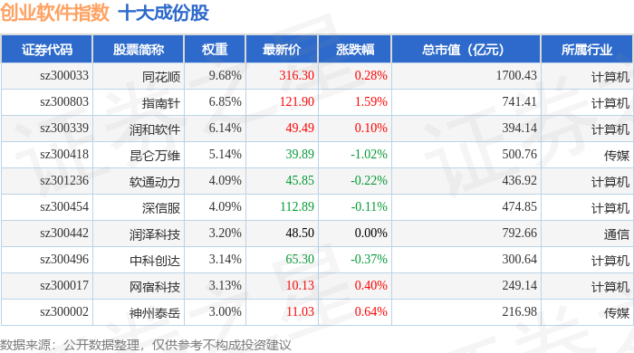 创业软件(399264)指数十大成份股详情如下: