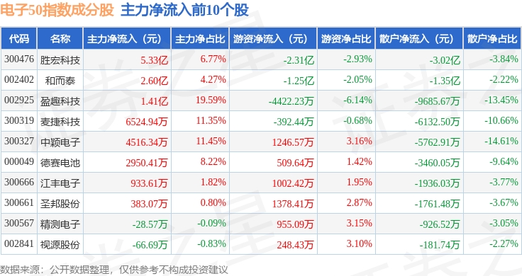 资金流向方面,电子50(399281)指数成份股当日主力资金净流出合计11.88亿元,游资资金净流出合计3.03亿元,散户资金净流入合计14.9亿元。成份股资金流向详情见下表:
