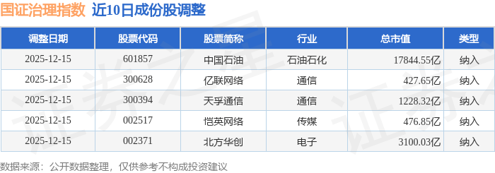 近10日内国证治理(399322)指数成份股做了调整,新纳入了5只股票。