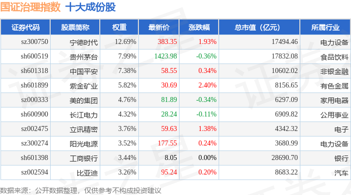 国证治理(399322)指数十大成份股详情如下: